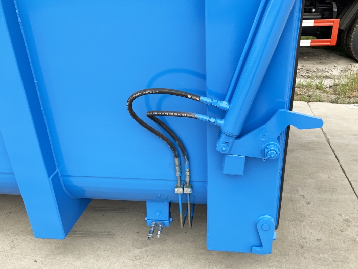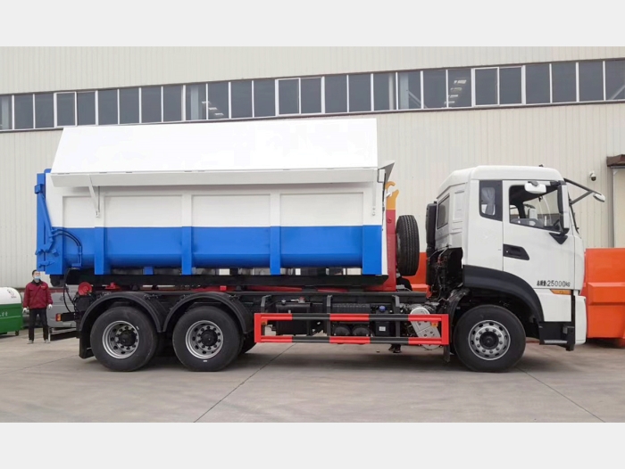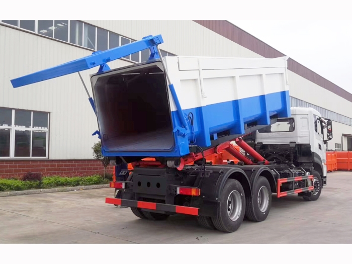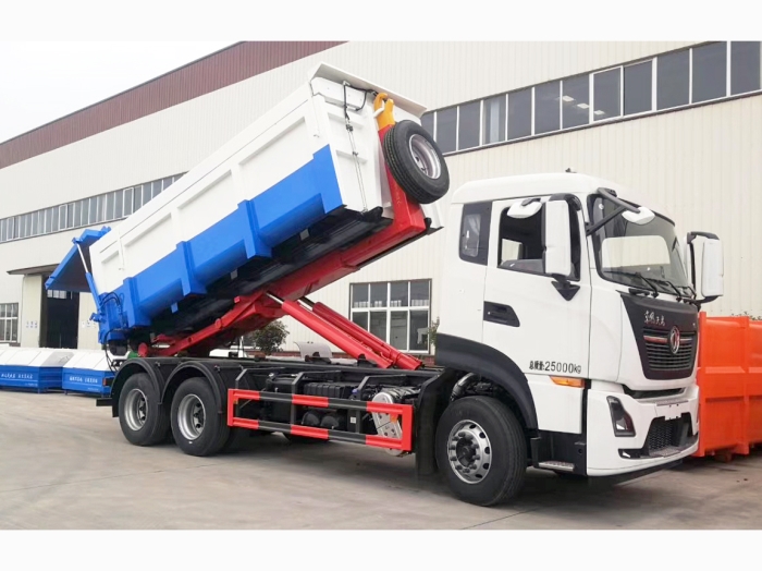 運(yùn)輸介質(zhì)為:泥污垃圾,液壓后門機(jī)構(gòu)密封,箱體頂部為翼展蓋,可翻轉(zhuǎn)打開,主要是利用勾臂垃圾車底盤自帶的發(fā)動(dòng)機(jī)為動(dòng)力,通過變速箱上安裝的取力器,取力器處安裝油泵,采用液壓機(jī)構(gòu)手動(dòng)或電控來(lái)實(shí)現(xiàn)箱體的上鉤、下卸、自卸等功能。車輛的箱體采用優(yōu)質(zhì)炭鋼板全密封焊接結(jié)構(gòu),具有重量輕、不產(chǎn)生二次污染等優(yōu)點(diǎn)。