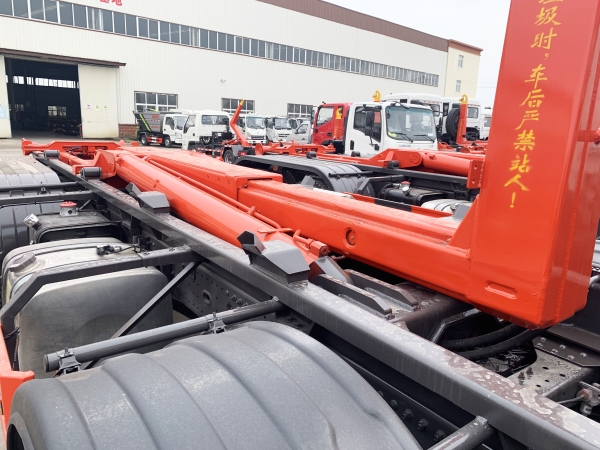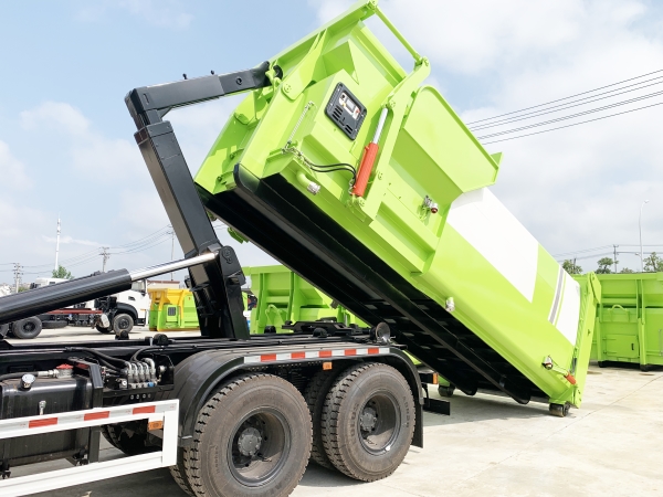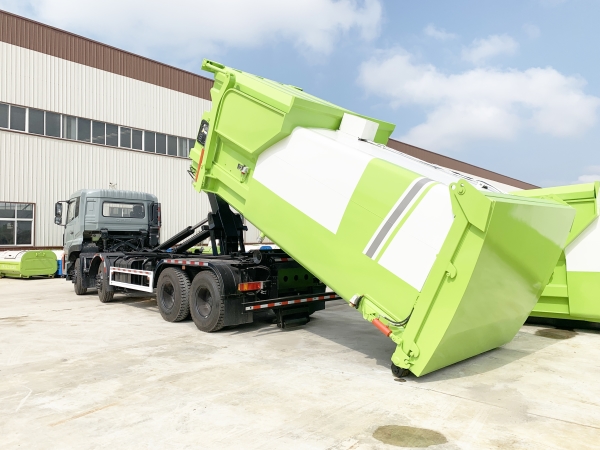 車廂可卸載式垃圾車,又稱勾臂式垃圾車、拉臂式垃圾車。該車廣泛適用與城市街道學(xué)校垃圾處理,可一車配備多個(gè)斗,各個(gè)垃圾點(diǎn)放置多個(gè),帶自卸功能,液壓操作,方便傾倒。在平日里可將車載垃圾箱放置到各個(gè)垃圾收集站,待垃圾收集滿后,該車可直接開赴至垃圾站,通過液壓系統(tǒng)的操控,可將垃圾車后座上加裝的勾臂放下,掛住站內(nèi)垃圾箱前端的連接點(diǎn),將垃圾箱拉至車體的后座上,此時(shí)即可啟動(dòng)車輛,將垃圾運(yùn)送至垃圾處理站內(nèi),進(jìn)行自卸式傾倒。該車主要的優(yōu)點(diǎn)就是可一車配多斗,一輛車就可以維持?jǐn)?shù)個(gè)垃圾收集站的運(yùn)轉(zhuǎn),效率高,且箱體為密封式設(shè)計(jì),不會(huì)造成二次污染。